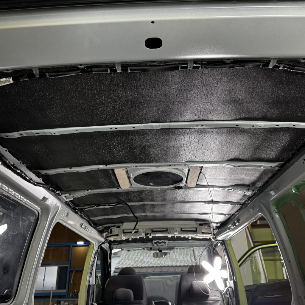 今回は トヨタ/ハイエース に、断熱制振施工と持ち込みのマックスファン取付、ダウンライトも取付させていただきました。