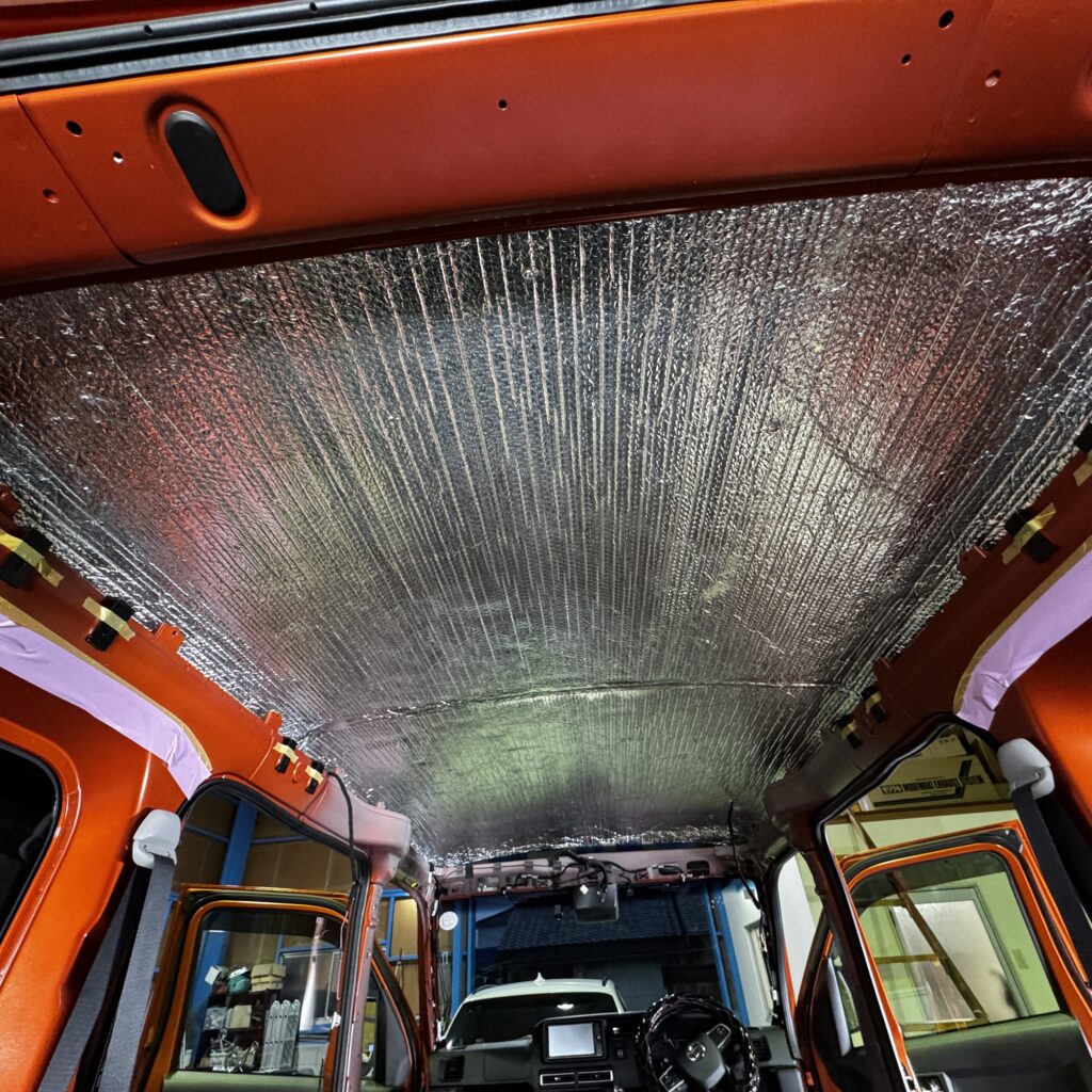 天井の残った両面テープを取り外し後は、お客様からのご希望でしたレアルシルトを施工後、アルミ遮熱シートを貼り付けです。